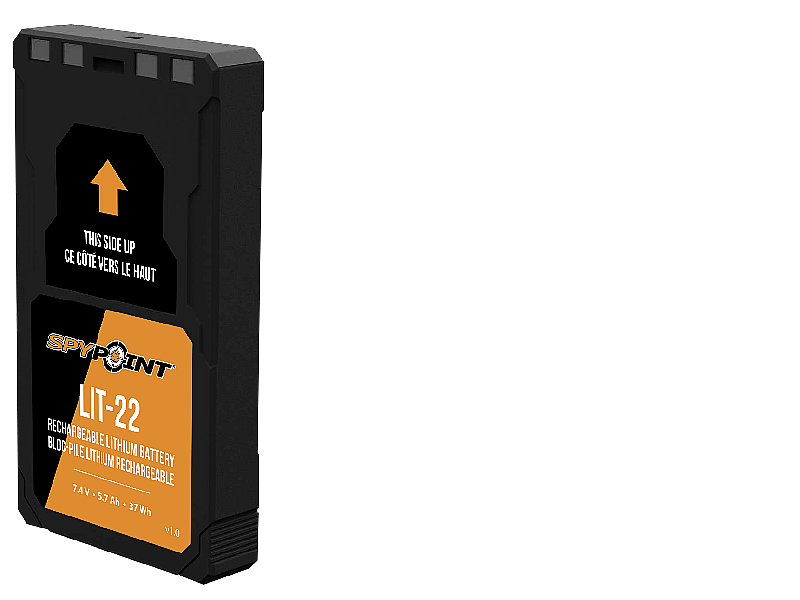 The Spypoint LIT-22 rechargeable lithium battery provides more power to the FLEX cellular wildlife camera, so you don't have to replace the batteries as often. It is a 7.4V, 5.4Ah battery that is easily installed after removing the standard battery tray. You can alternate between the battery tray and the LIT-22, so the camera can still have power from standard batteries while the LIT-22 is being recharged. You can also buy two LIT-22 batteries to ensure that the FLEX is powered by a rechargeable battery all year round.