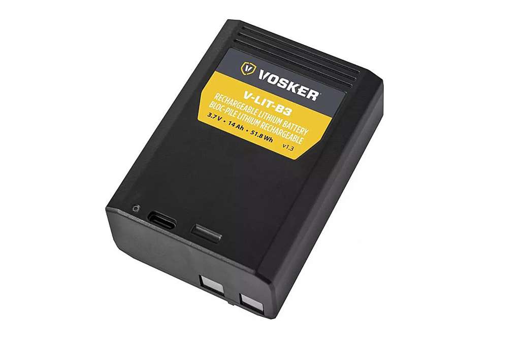 The Vosker V-LIT-B3 is a rechargeable lithium battery pack that can be used with the Vosker V300 and V150 wireless security cameras. It has a 14,000mAh capacity and lasts longer than alkaline batteries, even in cold temperatures.